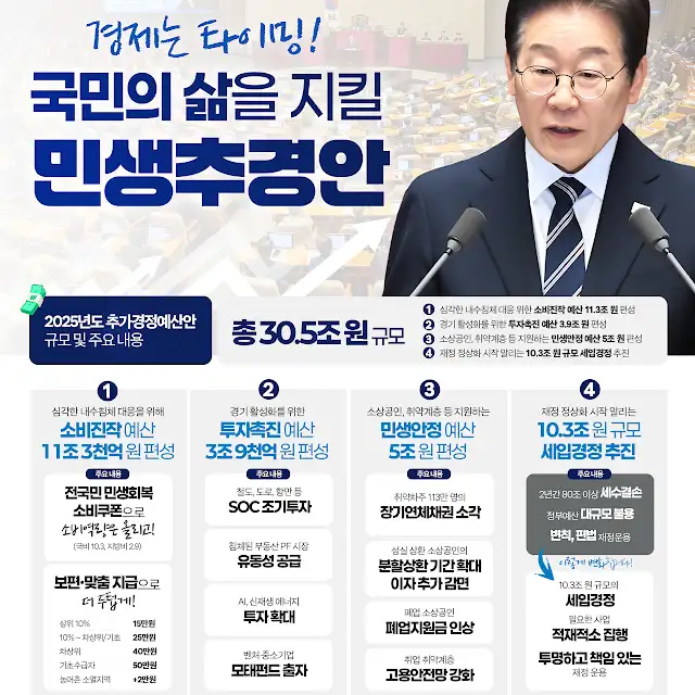 [대통령 메시지] 이재명 "경제 회복 위해 정부·국회가 나서야 할 때입니다" 민생추경안 강조 (2025년 6월 27일)📢 이재명 대통령, 민생추경안 통과 촉구 메시지2025년 6월 27일, 이재명 대통령이 경제 위기 극복과 민생 안정을 위한 30.5조원 규모의 민생추경안을 강조하며 국회의 초당적 협력을 당부했습니다.대통령은 이번 추경안을 경제 위기 해소를 위한 마중물이자, 경제 회복을 위한 최소한의 조치로 규정하며 국민의 삶을 지키기 위해 반드시 필요한 대책이라고 밝혔습니다.📝 이재명 대통령 메시지 전문지금은, 경제가 다시 뛸 수 있도록 정부가 나서야 할 때입니다.이번 추경안은 경제 위기 가뭄 해소를 위한 마중물이자, 경제 회복을 위한 최소한의 조치입니다.대한민국 경제의 활력을 되찾고, 국민이 행복한..