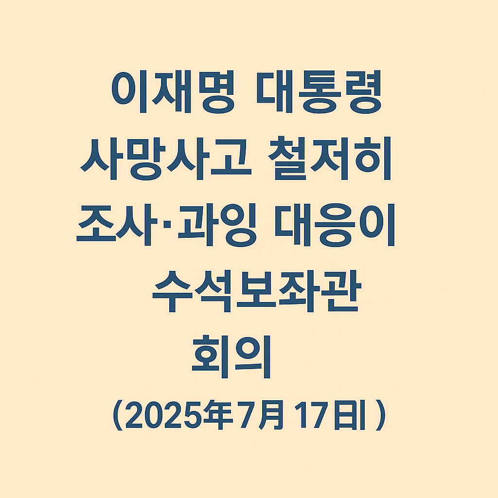 [대통령 브리핑] 이재명 대통령 “사망사고 철저히 조사…과잉 대응이 낫다” 수석보좌관회의 주요 지시 (2025년 7월 17일)📌 대통령 주재 수석보좌관회의 개요2025년 7월 17일 오후, 이재명 대통령은 대통령실 수석보좌관회의를 주재하며 최근 발생한 재해와 안전사고에 대한 대응 방안을 집중 논의했습니다. 이날 회의에서는 오산, 아산, 당진 등에서 발생한 사망사고 및 침수 피해에 대한 보고가 이루어졌으며, 대통령은 이와 관련해 강력한 조사 및 대응 지침을 내렸습니다.⚠️ “사망사고는 철저히 조사…과잉 대응이 낫다”이 대통령은 “사망사고를 유형별로 점검하고, 관리 미흡으로 인한 인재(人災)가 아닌지 철저히 조사하라”고 지시했습니다. 이어 “과잉 대응은 소극 대응보다 낫다”며, 재난 대응 시 선제적이고 적..
