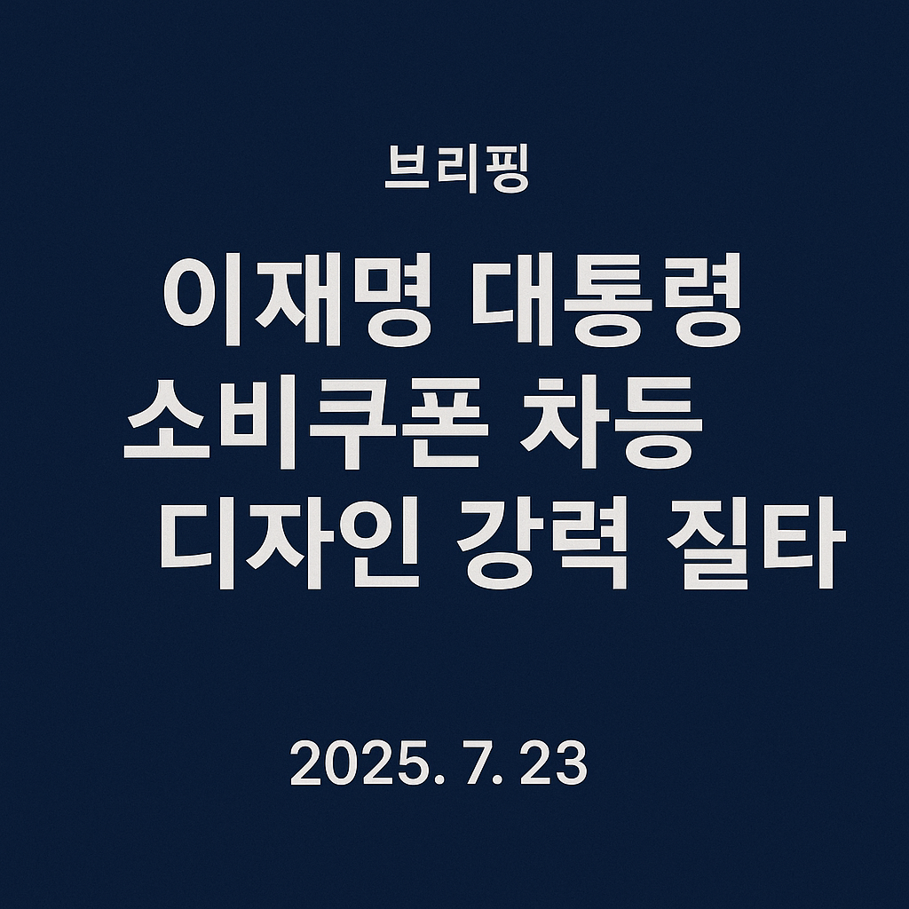 [브리핑] 이재명 대통령, 소비쿠폰 선불카드 색상 논란에 강력 질타 (2025년 7월 23일)📌 브리핑 개요2025년 7월 23일, 이재명 대통령은 일부 지방자치단체가 지급한 민생회복 소비쿠폰 선불카드에서 색상에 따라 금액 차이를 두는 방식으로 취약계층 여부가 외부에 드러난 것에 대해 강도 높게 질타했습니다. 이는 단순한 행정 착오를 넘어 인권 침해 요소까지 내포된 사안으로, 대통령은 해당 행정을 “공급자 중심의 편의주의적 발상”이라 지적하며 즉각 시정을 지시했습니다.🗣️ 대통령 메시지 요지 선불카드 색상 구분은 사용자 소득수준과 취약계층 노출로 이어지는 인권 감수성 결여 사례 “공급자 중심의 탁상행정”, “행정 편의주의적 발상”이라고 규정 즉각적인 시정과 전수조사 지시 “민생 회복을 위한 소..