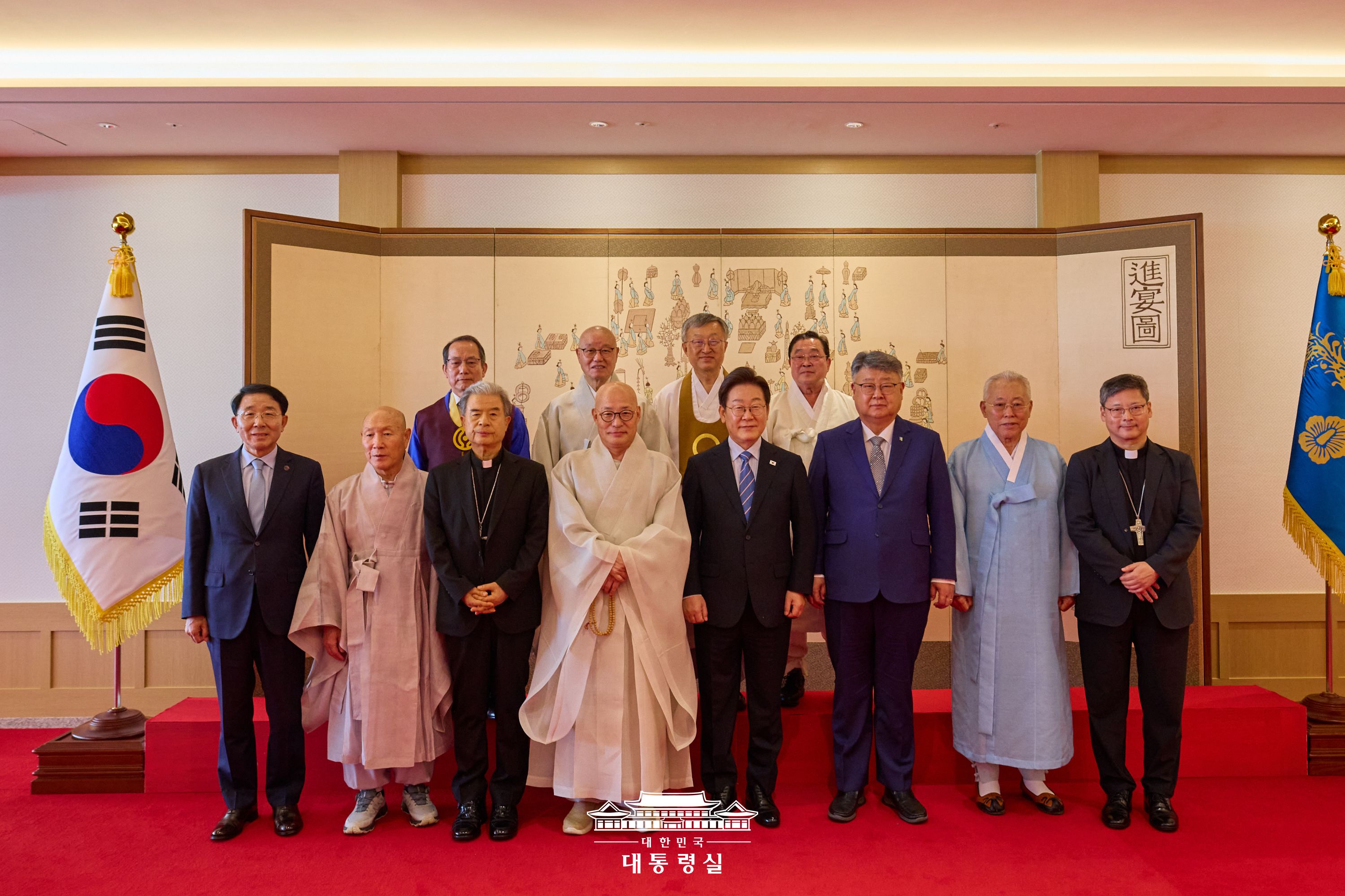 이재명 대통령, 종교지도자 초청 오찬 간담회 주재 (2025년 7월 9일)2025년 7월 9일, 이재명 대통령은 주요 종교 지도자들을 청와대 영빈관에 초청해 오찬 간담회를 가졌습니다.이번 간담회는 국민통합과 사회적 연대를 위한 다양한 의견을 나누는 자리로 마련되었으며, 종교계 원로들의 제언과 대통령의 경청이 중심이 된 진지한 대화의 장이었습니다.이 대통령은 "대한민국은 다름을 인정하는 사회로 나아가야 하며, 종교계의 역할이 중요하다"고 강조했습니다. 참석자들은 상호 존중, 약자 보호, 평화 증진의 가치를 기반으로 정부와 함께 협력해 나갈 의지를 피력했습니다.관련 정보 더보기 [대통령실 공식 사진 페이지 보기] [대통령 사진 아카이브 전체 보기]사진이 의미 있게 느껴지셨다면 공감과 댓글로 소통해 주세..