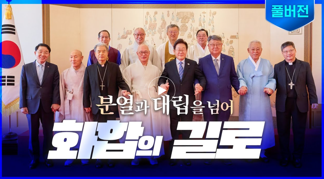 종교 지도자들과 함께한 오찬, 사회통합의 길 모색 (2025년 7월 9일)📌 영상 주요 메시지2025년 7월 9일, 이재명 대통령은 7대 종단 종교 지도자들을 초청해 오찬 간담회를 열고, 사회통합을 위한 종교계의 지혜와 조언을 청취했습니다.이날 영상에서는 대통령과 진우 스님을 비롯한 종교 지도자들의 발언이 담겼으며, 사회 갈등 해소와 공동체 회복을 위한 진솔한 대화가 오갔습니다.🗣 음성·화면 자막 전문[음성자막]제가 취임한 지 한 달 남짓됐는데제가 선거 과정에서도 걱정했던 것처럼우리 사회가 지나치게 분열적이고 대립적이고갈등도 많이 격화돼 있어서 참 걱정입니다일단은 지금 한 달 동안은조금씩 그게 봉합되어가는 모양새가 보여지기도 하는데그거야 정치 상황이 바뀌면 어떻게 될지 알 수 없는 것입니다그래서 우리..
